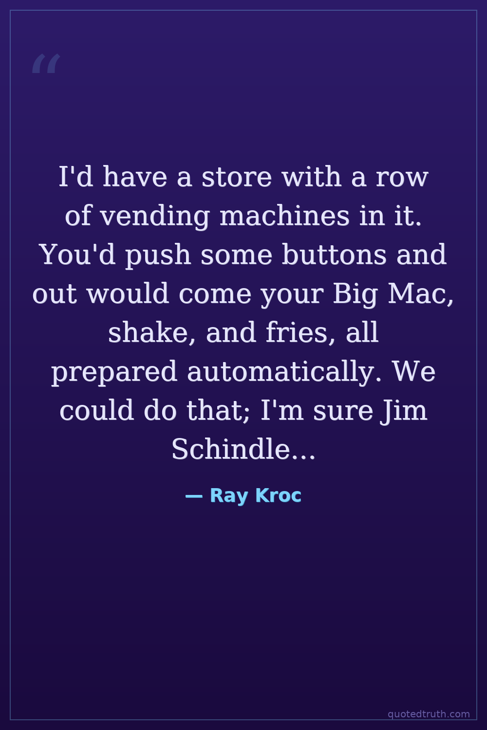 I'd have a store with a row of vending machines in it. You'd push some buttons and out would come your Big Mac, shake, and fries, all prepared automatically. We could do that; I'm sure Jim Schindler could work it out. But we never will. McDonald's is a people business, and the smile on that counter girl's face when she takes your order is a vital part of our image.