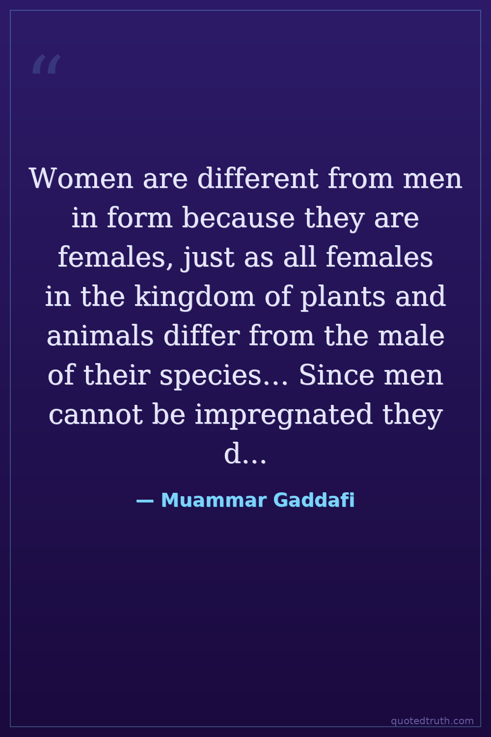 Women are different from men in form because they are females, just as all females in the kingdom of plants and animals differ from the male of their species… Since men cannot be impregnated they do not experience the ailments that women do. She breastfeeds for nearly two years.