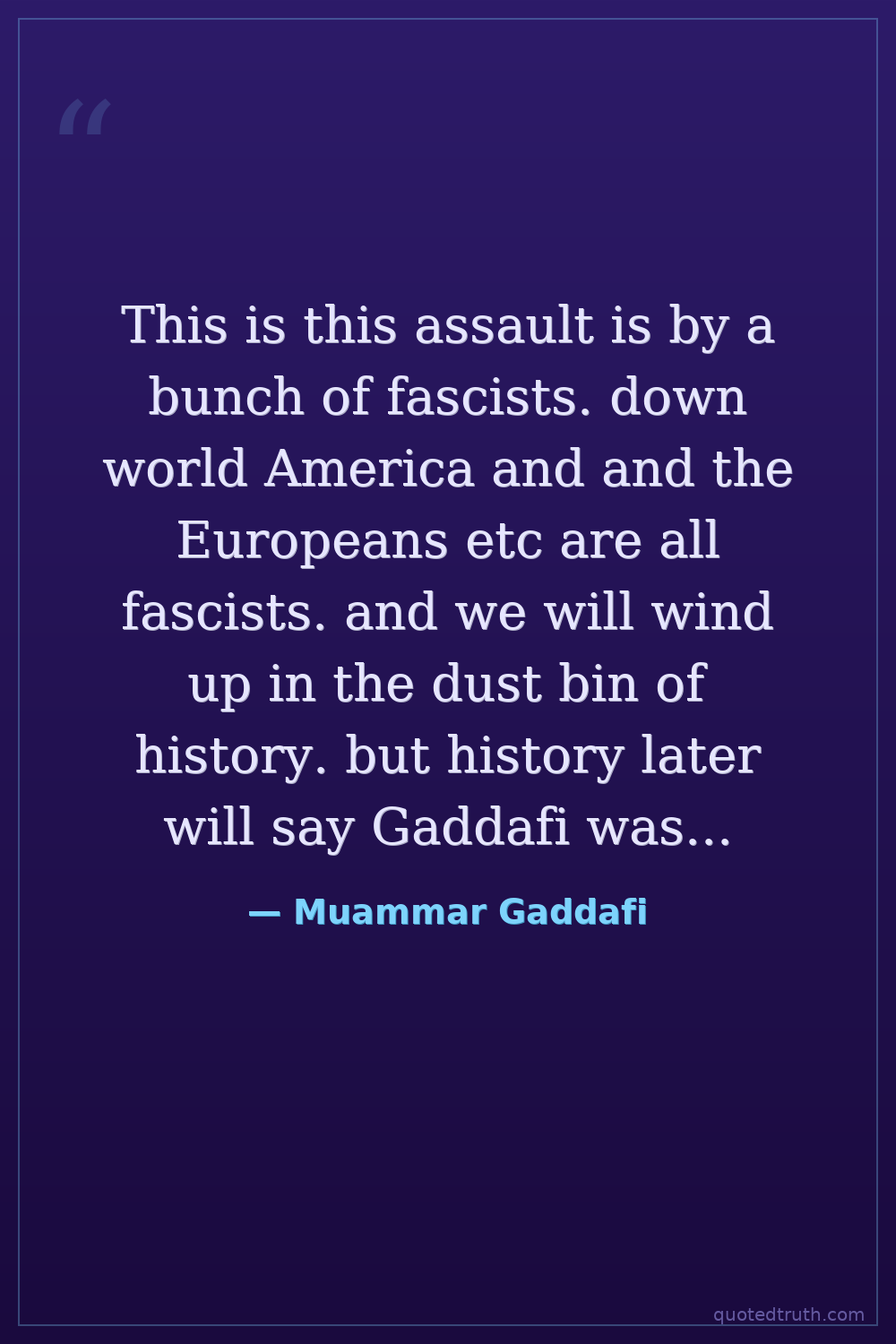 This is this assault is by a bunch of fascists. down world America and and the Europeans etc are all fascists. and we will wind up in the dust bin of history. but history later will say Gaddafi was the greatest.
