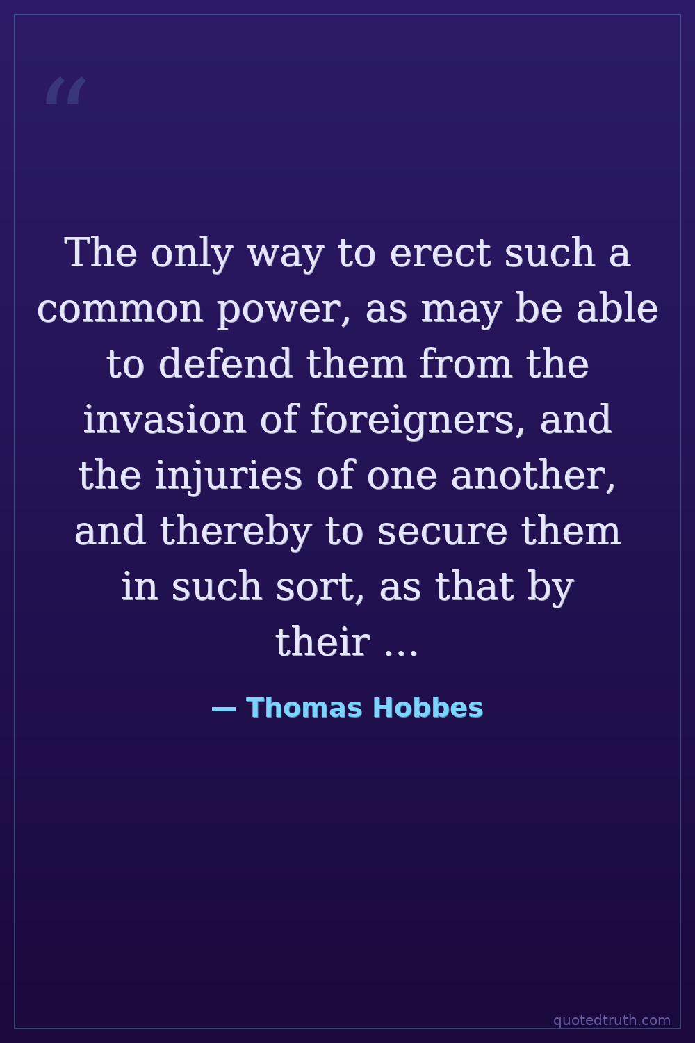The only way to erect such a common power, as may be able to defend them from the invasion of foreigners, and the injuries of one another, and thereby to secure them in such sort, as that by their own industry, and by the fruits of the earth, they may nourish themselves and live contentedly; is, to confer all their power and strength upon one man, or upon one assembly of men, that may reduce all their wills, by plurality of voices, unto one will.