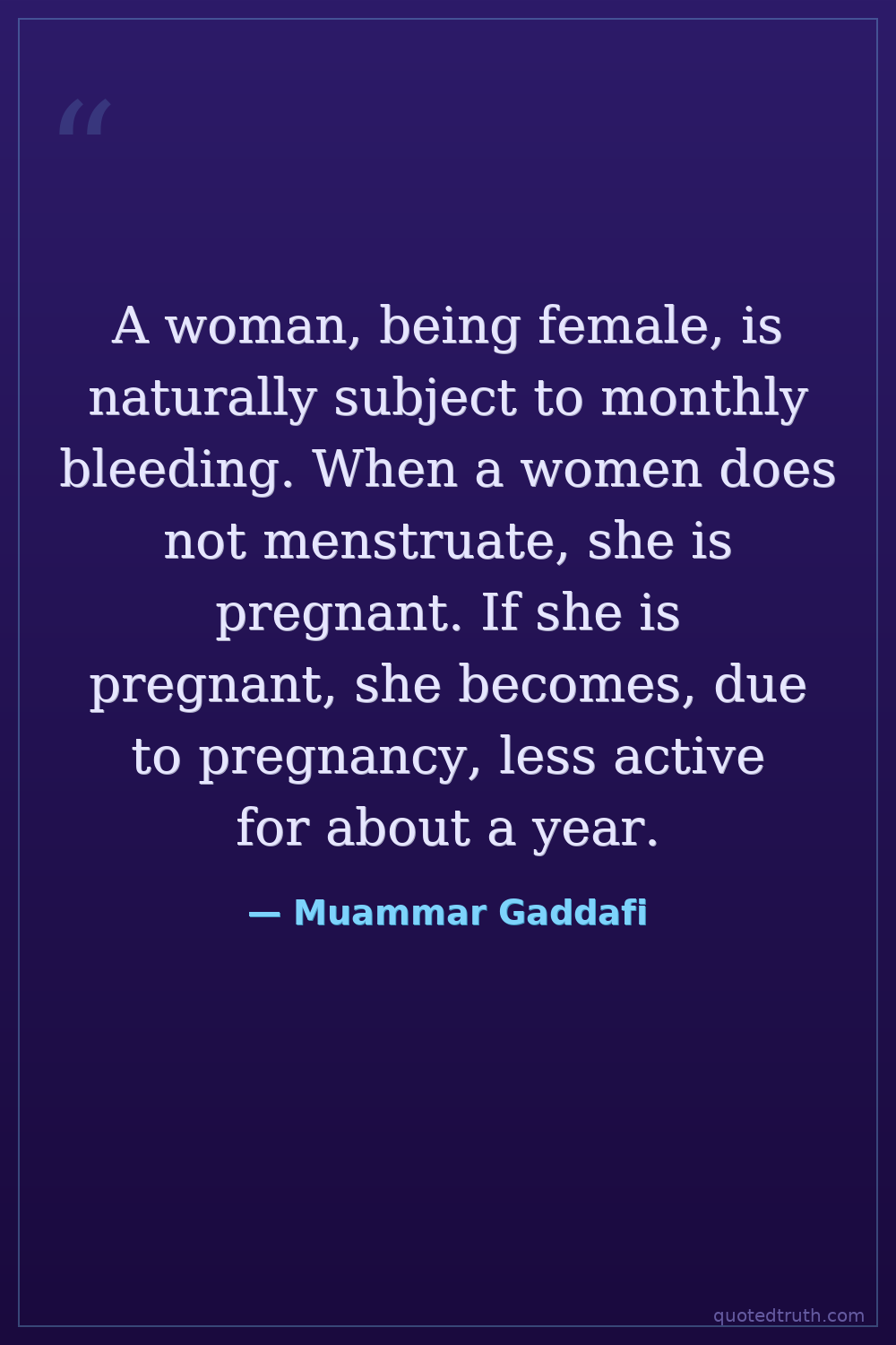 A woman, being female, is naturally subject to monthly bleeding. When a women does not menstruate, she is pregnant. If she is pregnant, she becomes, due to pregnancy, less active for about a year.