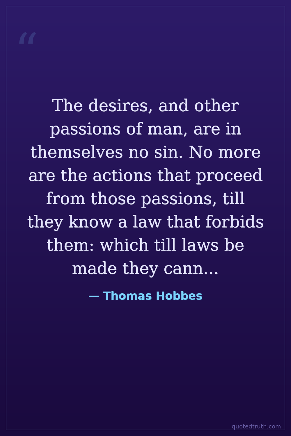 The desires, and other passions of man, are in themselves no sin. No more are the actions that proceed from those passions, till they know a law that forbids them: which till laws be made they cannot know: nor can any law be made, till they have agreed upon the person that shall make it.