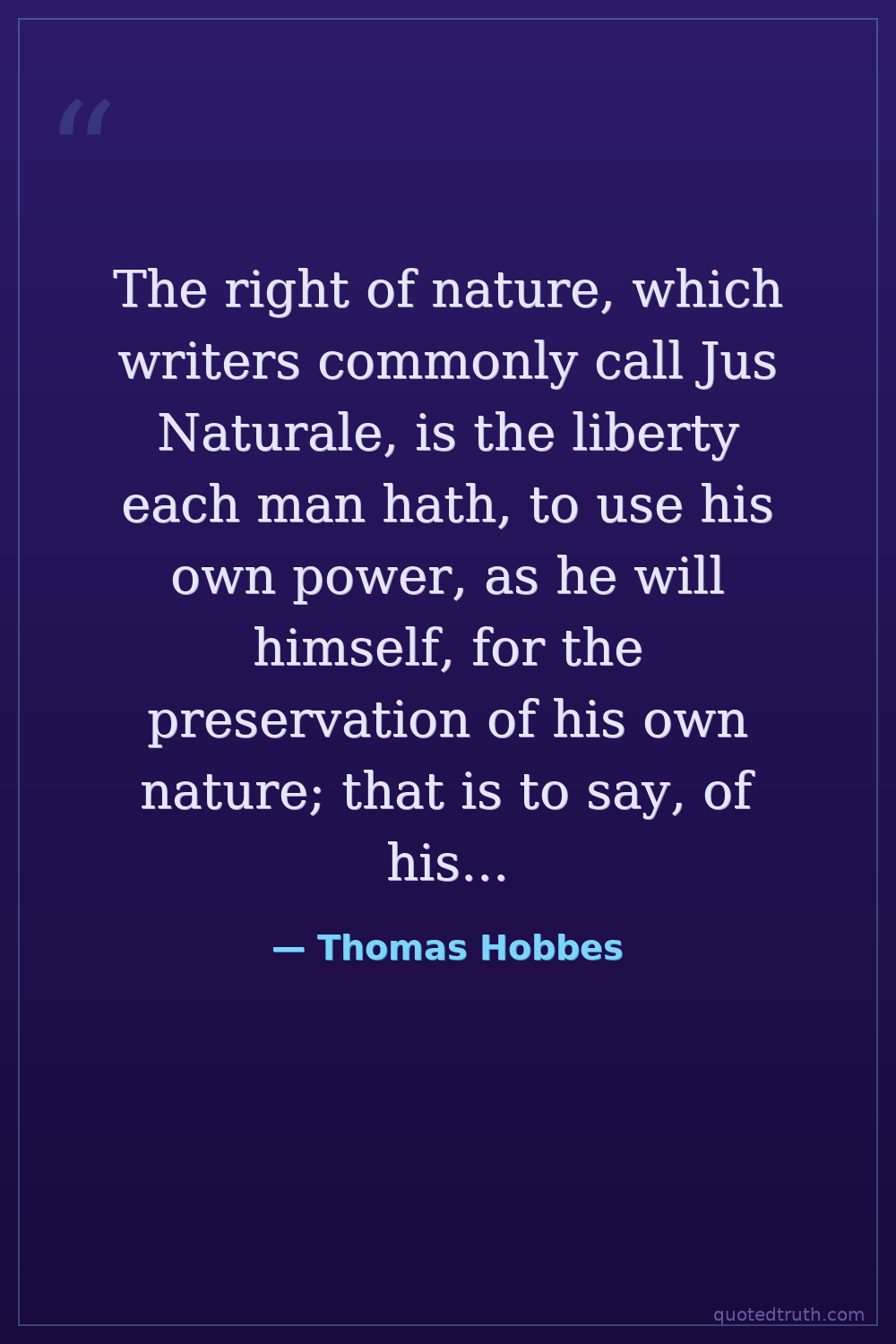 The right of nature, which writers commonly call Jus Naturale, is the liberty each man hath, to use his own power, as he will himself, for the preservation of his own nature; that is to say, of his own life; and consequently, of doing any thing, which, in his own judgement, and reason, he shall conceive to be the aptest means thereunto.