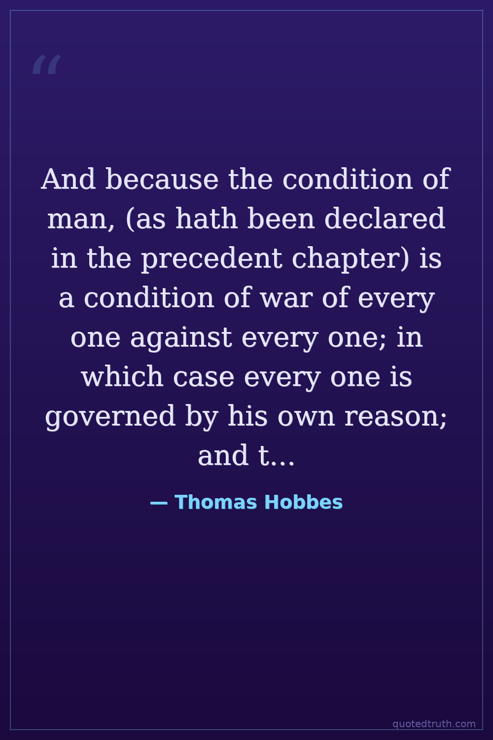 And because the condition of man, (as hath been declared in the precedent chapter) is a condition of war of every one against every one; in which case every one is governed by his own reason; and there is nothing he can make use of, that may not be a help unto him, in preserving his life against his enemies; it followeth, that in such a condition, every man has a right to every thing; even to one another's body.