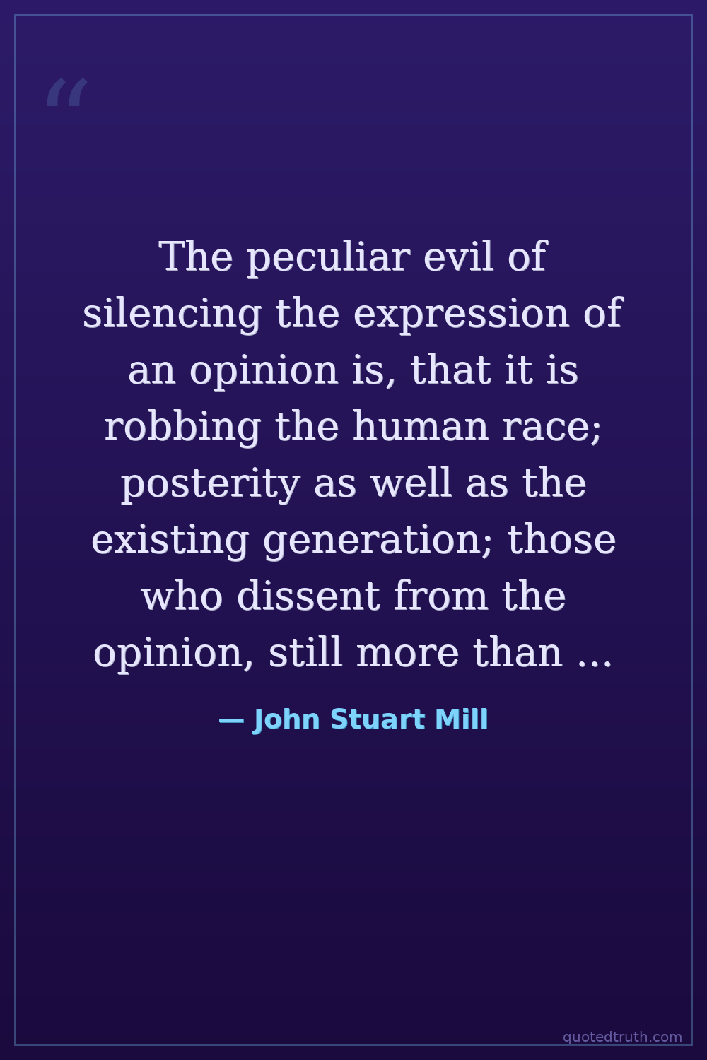 The peculiar evil of silencing the expression of an opinion is, that it is robbing the human race; posterity as well as the existing generation; those who dissent from the opinion, still more than those who hold it. If the opinion is right, they are deprived of the opportunity of exchanging error for truth: if wrong, they lose, what is almost as great a benefit, the clearer perception and livelier impression of truth, produced by its collision with error.