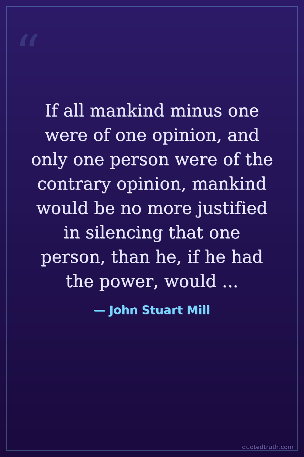 If all mankind minus one were of one opinion, and only one person were of the contrary opinion, mankind would be no more justified in silencing that one person, than he, if he had the power, would be justified in silencing mankind.