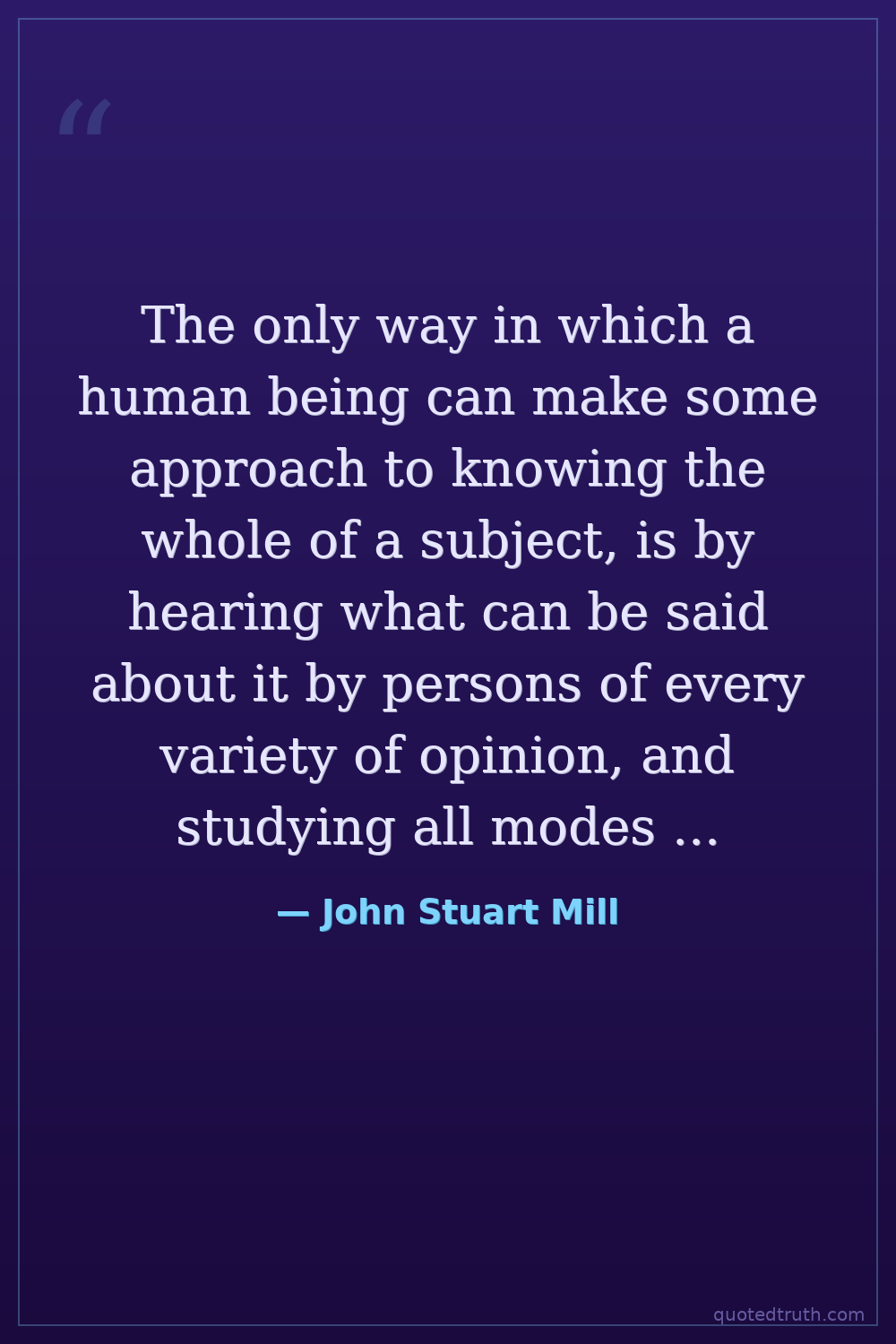 The only way in which a human being can make some approach to knowing the whole of a subject, is by hearing what can be said about it by persons of every variety of opinion, and studying all modes in which it can be looked at by every character of mind.