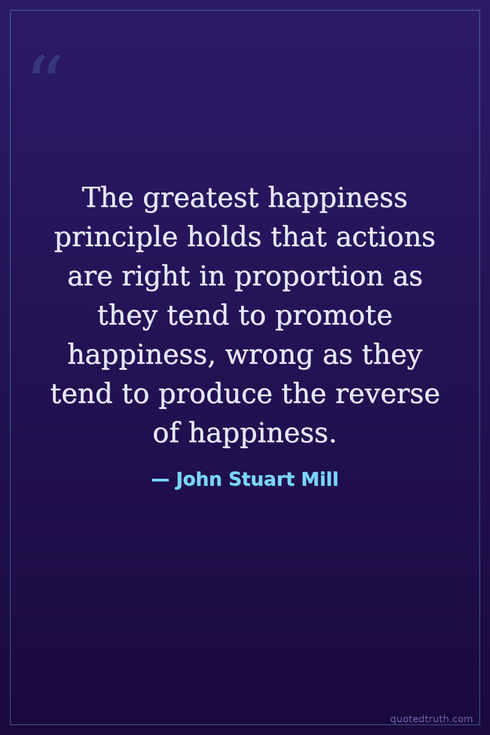 The greatest happiness principle holds that actions are right in proportion as they tend to promote happiness, wrong as they tend to produce the reverse of happiness.
