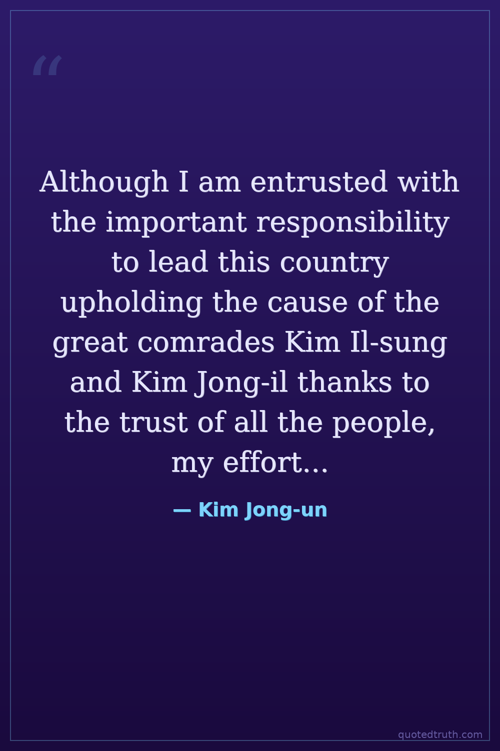 Although I am entrusted with the important responsibility to lead this country upholding the cause of the great comrades Kim Il-sung and Kim Jong-il thanks to the trust of all the people, my efforts and sincerity have not been sufficient enough to rid our people of the difficulties in their lives.