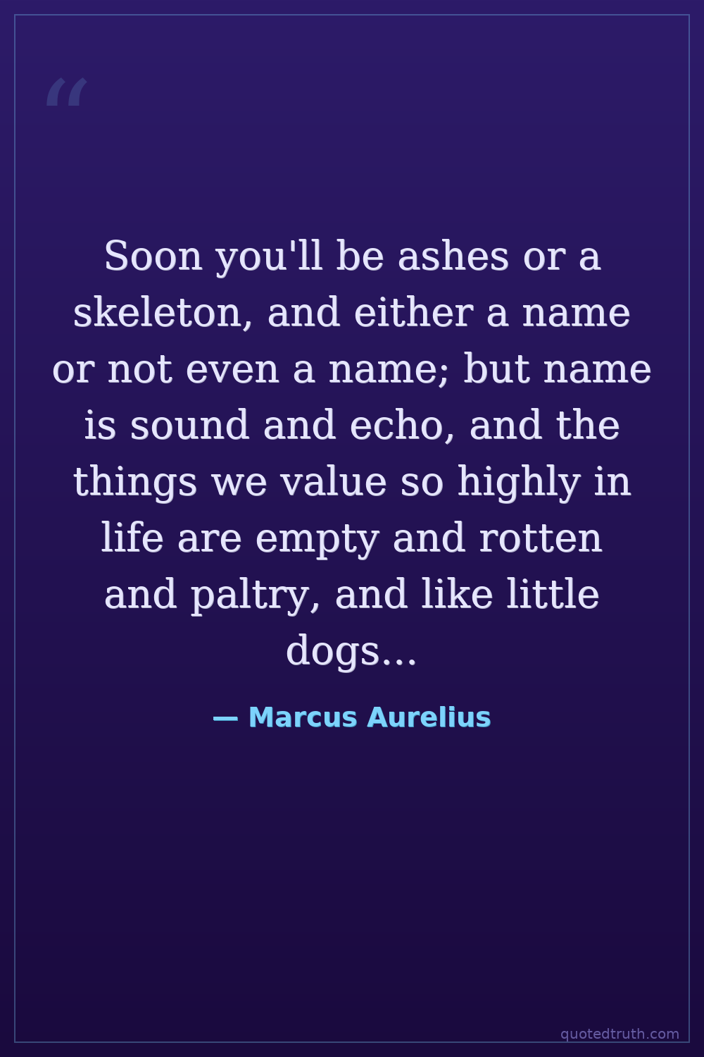 Soon you'll be ashes or a skeleton, and either a name or not even a name; but name is sound and echo, and the things we value so highly in life are empty and rotten and paltry, and like little dogs biting one another, and little children quarreling, crying, and then laughing. But loyalty and modesty and justice and truth are fled 'up to Olympus from the wide-pathed earth.' What then is there to hold you back?