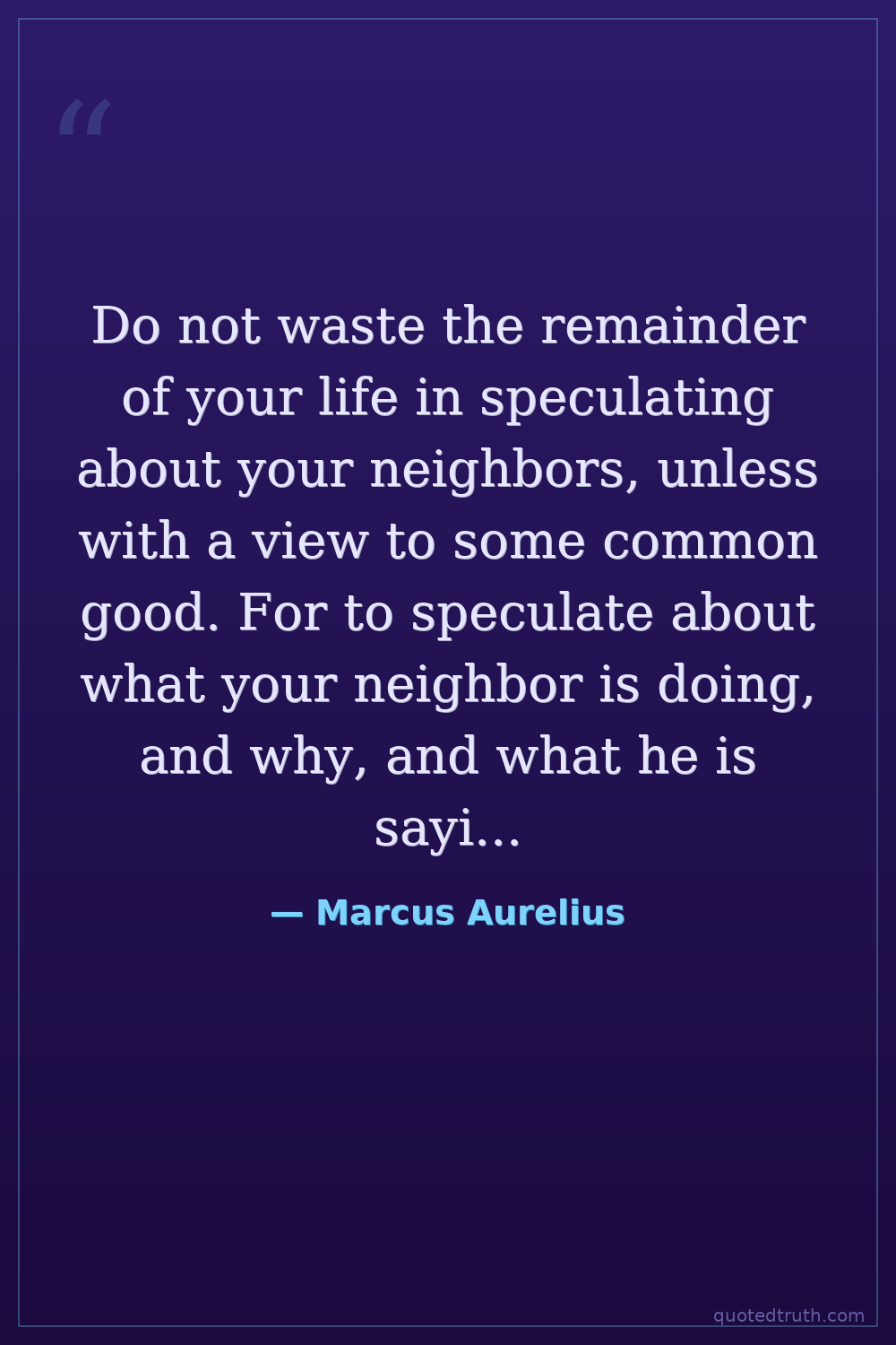 Do not waste the remainder of your life in speculating about your neighbors, unless with a view to some common good. For to speculate about what your neighbor is doing, and why, and what he is saying, and what he is thinking of, and for what purpose, and how much he troubles himself with all these things, is just to lose the opportunity of doing something else.
