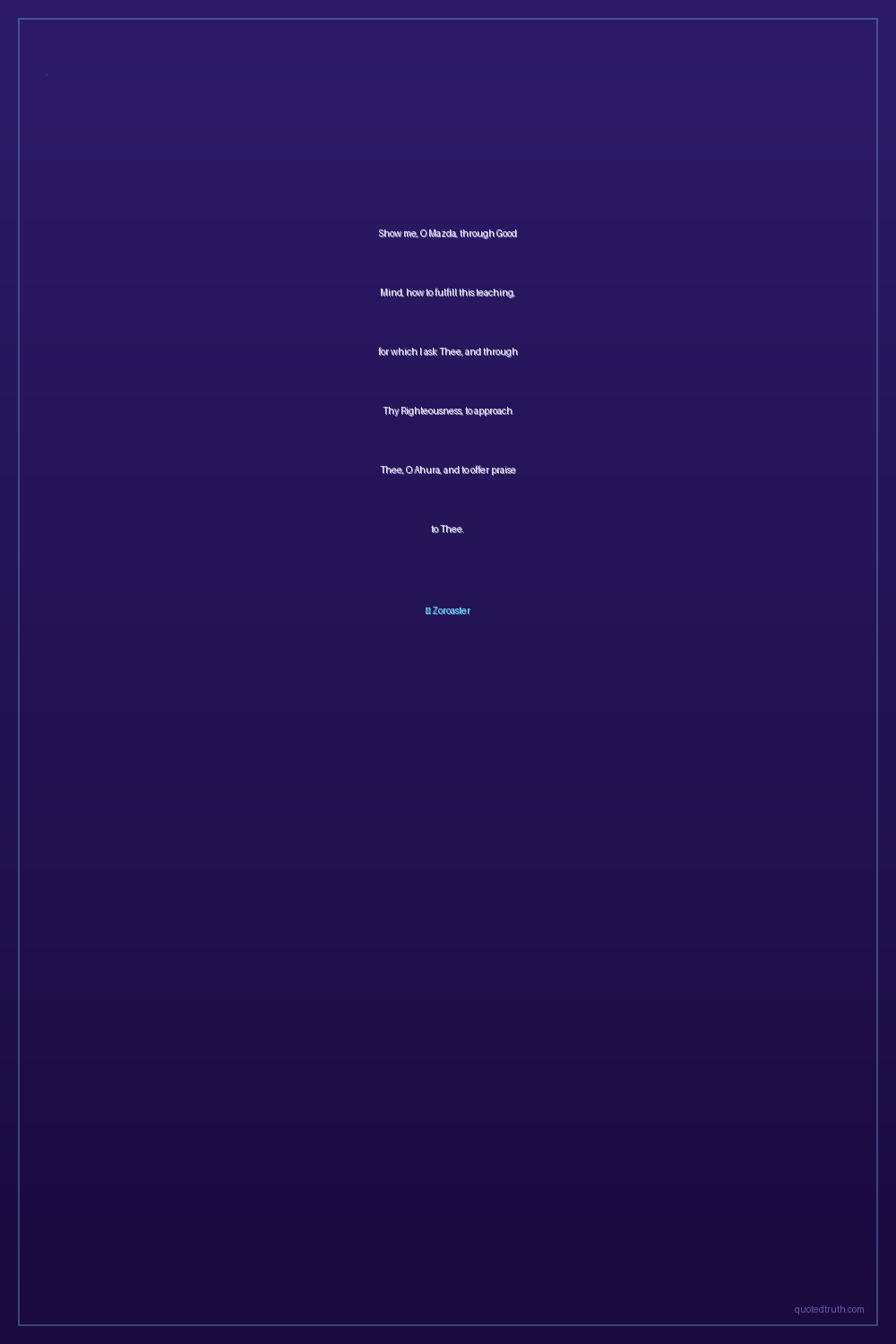 Show me, O Mazda, through Good Mind, how to fulfill this teaching, for which I ask Thee, and through Thy Righteousness, to approach Thee, O Ahura, and to offer praise to Thee.