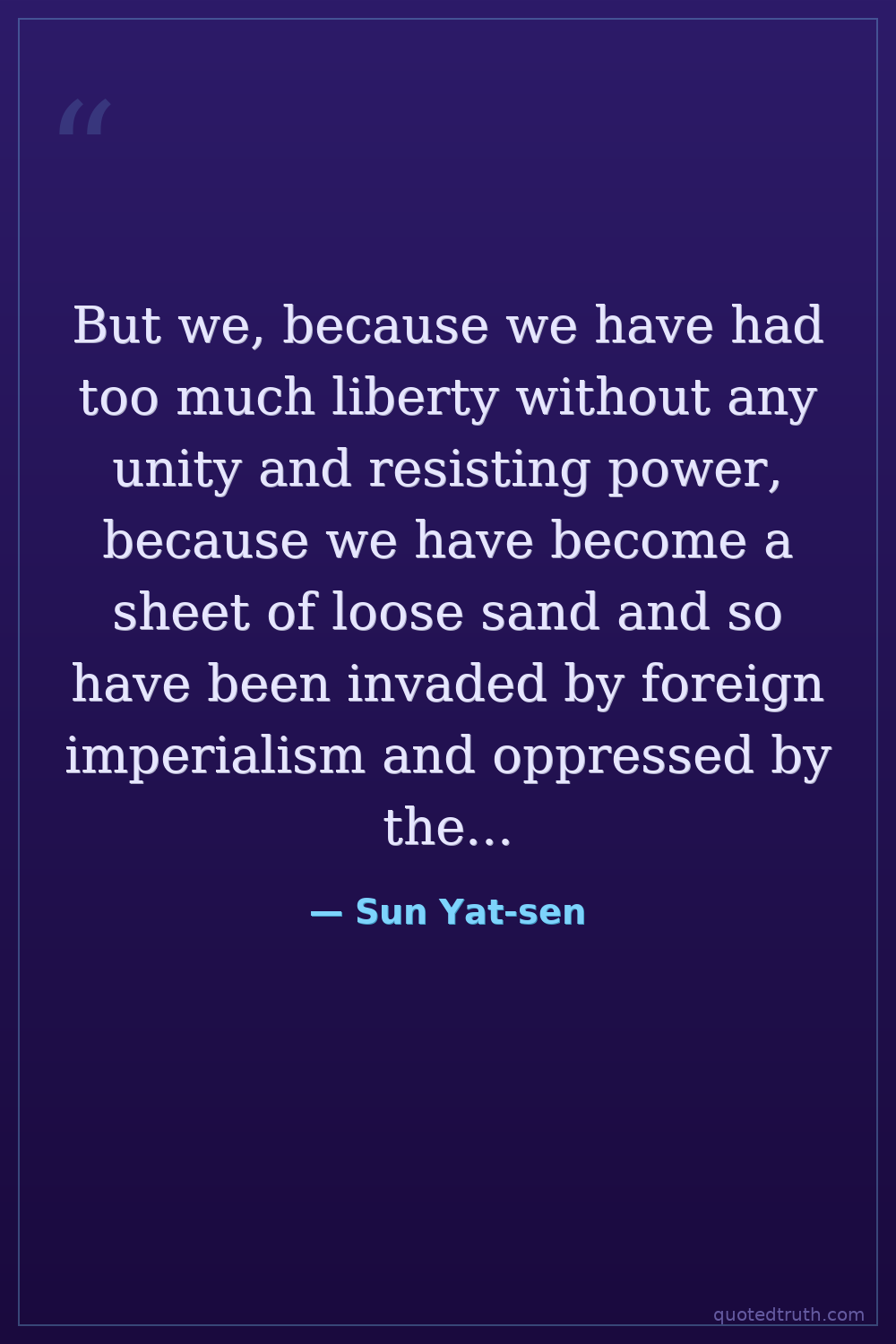 But we, because we have had too much liberty without any unity and resisting power, because we have become a sheet of loose sand and so have been invaded by foreign imperialism and oppressed by the economic control and trade wars of the Powers, without being able to resist, must break down individual liberty and become pressed together into an unyielding body like the firm rock which is formed by the addition of cement to sand.