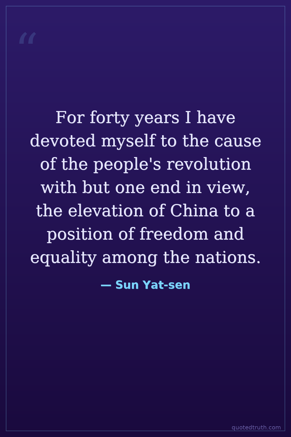 For forty years I have devoted myself to the cause of the people's revolution with but one end in view, the elevation of China to a position of freedom and equality among the nations.