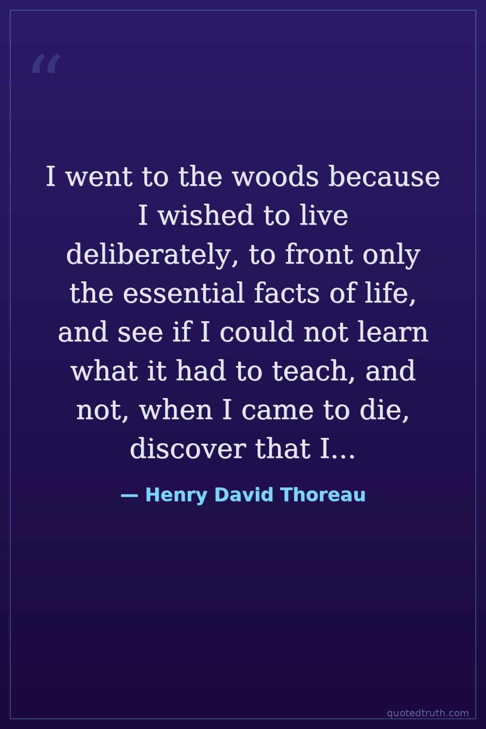 I went to the woods because I wished to live deliberately, to front only the essential facts of life, and see if I could not learn what it had to teach, and not, when I came to die, discover that I had not lived.