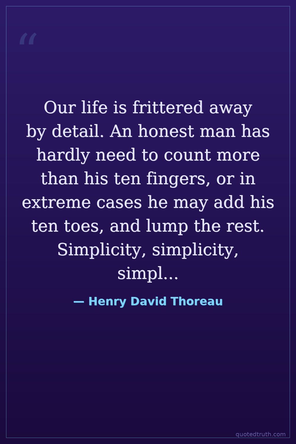 Our life is frittered away by detail. An honest man has hardly need to count more than his ten fingers, or in extreme cases he may add his ten toes, and lump the rest. Simplicity, simplicity, simplicity! I say, let your affairs be as two or three, and not a hundred or a thousand; instead of a million count half a dozen, and keep your accounts on your thumb-nail.