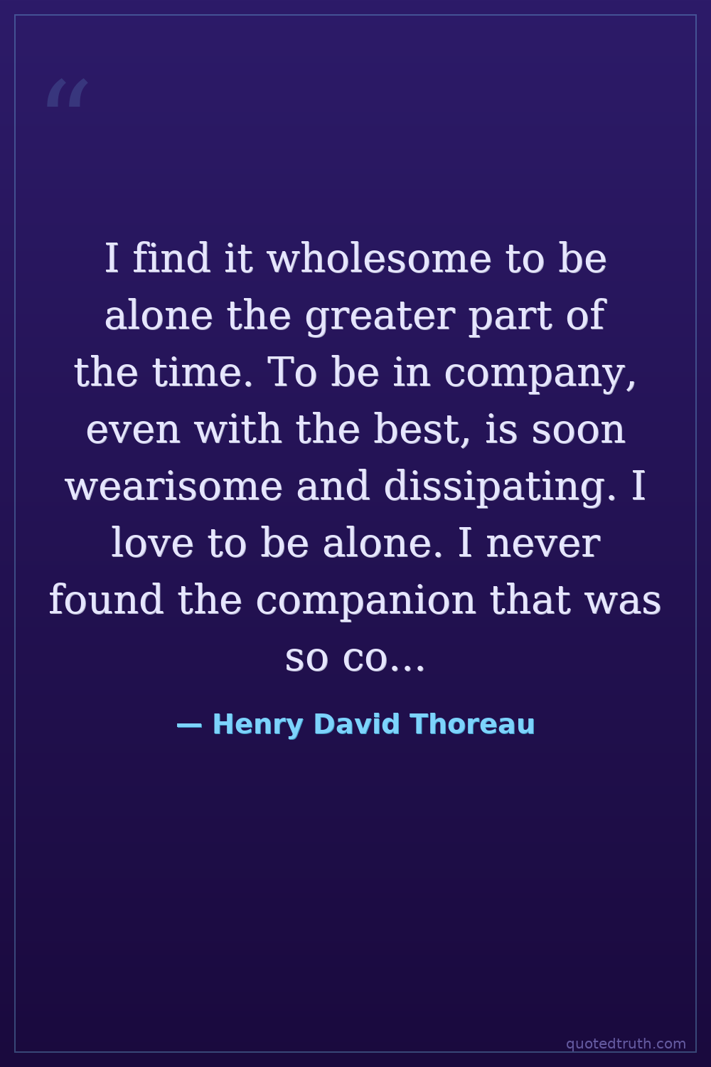 I find it wholesome to be alone the greater part of the time. To be in company, even with the best, is soon wearisome and dissipating. I love to be alone. I never found the companion that was so companionable as solitude.