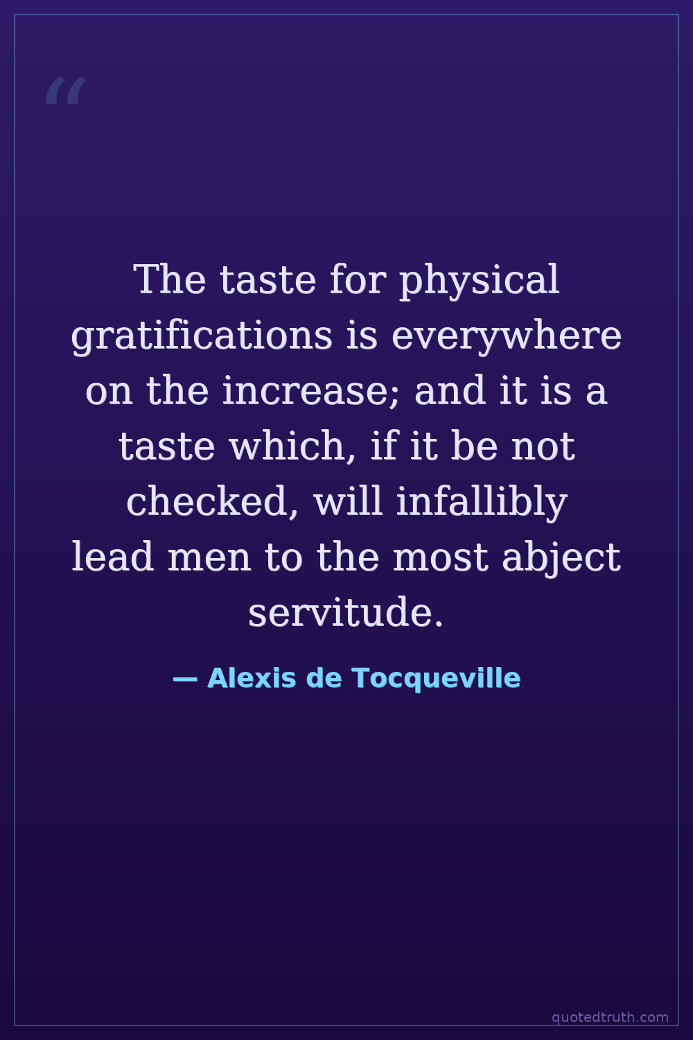 The taste for physical gratifications is everywhere on the increase; and it is a taste which, if it be not checked, will infallibly lead men to the most abject servitude.