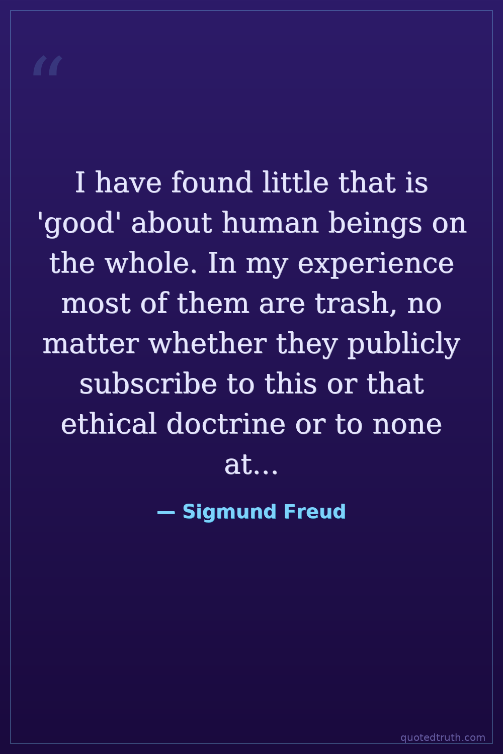 I have found little that is 'good' about human beings on the whole. In my experience most of them are trash, no matter whether they publicly subscribe to this or that ethical doctrine or to none at all. That is something you cannot say aloud, or perhaps even think.