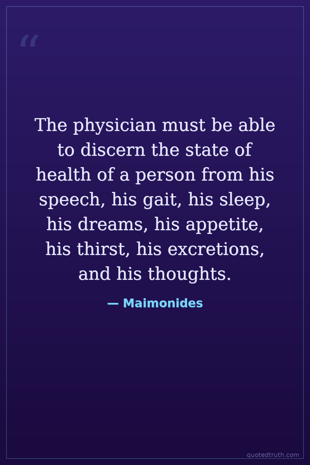 The physician must be able to discern the state of health of a person from his speech, his gait, his sleep, his dreams, his appetite, his thirst, his excretions, and his thoughts.