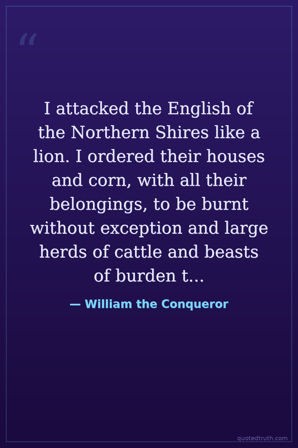 I attacked the English of the Northern Shires like a lion. I ordered their houses and corn, with all their belongings, to be burnt without exception and large herds of cattle and beasts of burden to be destroyed wherever they were found. It was there I took revenge on masses of people by subjecting them to a cruel famine; and by doing so — alas! — I became the murderer of many thousands of that fine race.