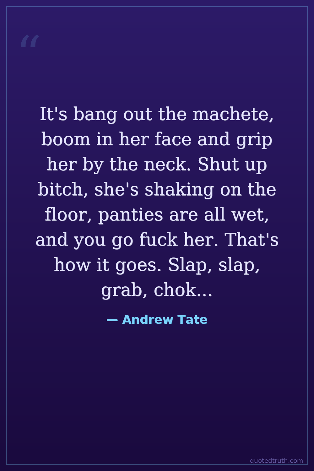 It's bang out the machete, boom in her face and grip her by the neck. Shut up bitch, she's shaking on the floor, panties are all wet, and you go fuck her. That's how it goes. Slap, slap, grab, choke, shut up bitch, sex.