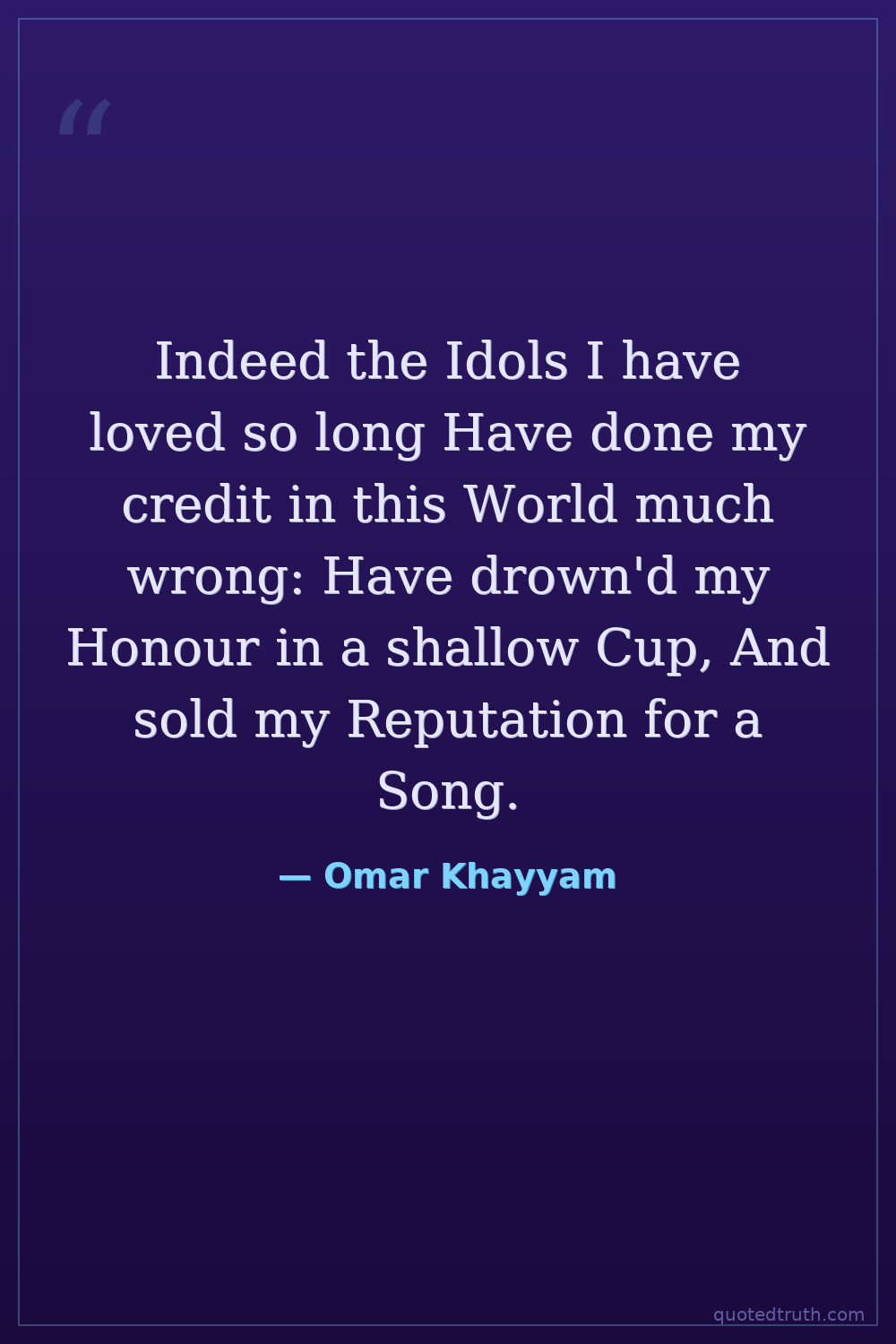 Indeed the Idols I have loved so long Have done my credit in this World much wrong: Have drown'd my Honour in a shallow Cup, And sold my Reputation for a Song.
