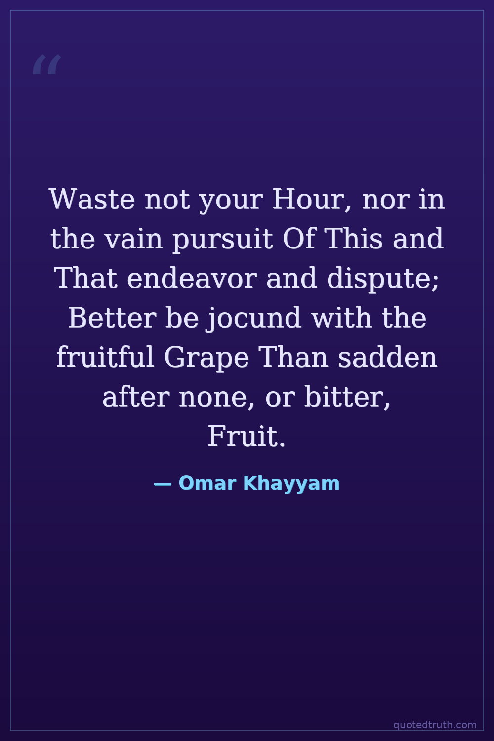 Waste not your Hour, nor in the vain pursuit Of This and That endeavor and dispute; Better be jocund with the fruitful Grape Than sadden after none, or bitter, Fruit.