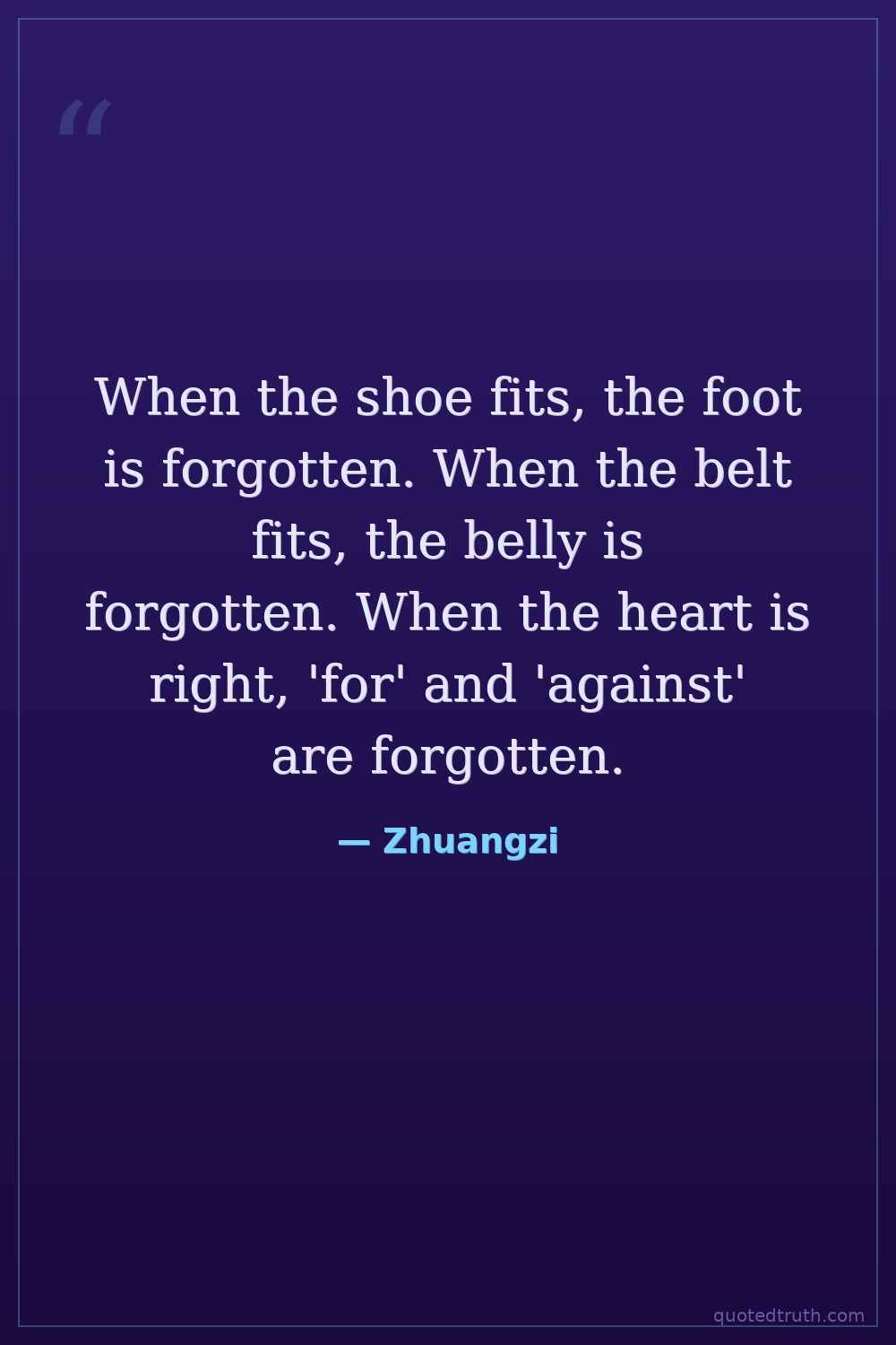 When the shoe fits, the foot is forgotten. When the belt fits, the belly is forgotten. When the heart is right, 'for' and 'against' are forgotten.