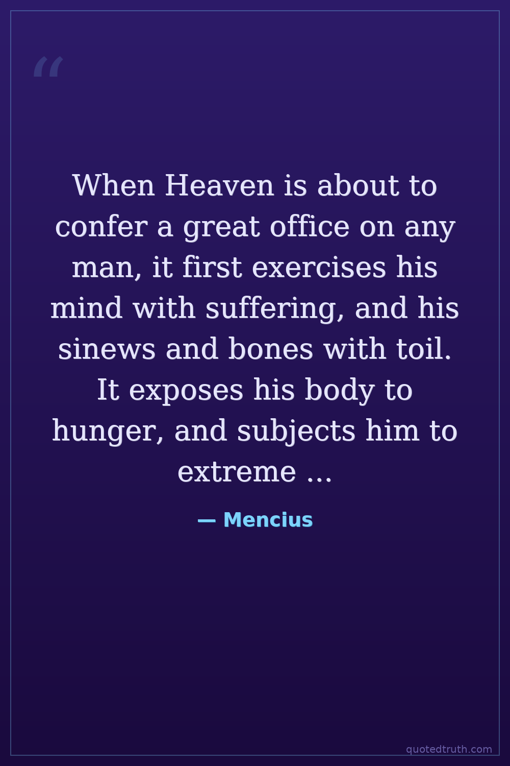 When Heaven is about to confer a great office on any man, it first exercises his mind with suffering, and his sinews and bones with toil. It exposes his body to hunger, and subjects him to extreme poverty. It confounds his undertakings. By all these methods it stimulates his mind, hardens his nature, and supplies his incompetencies.