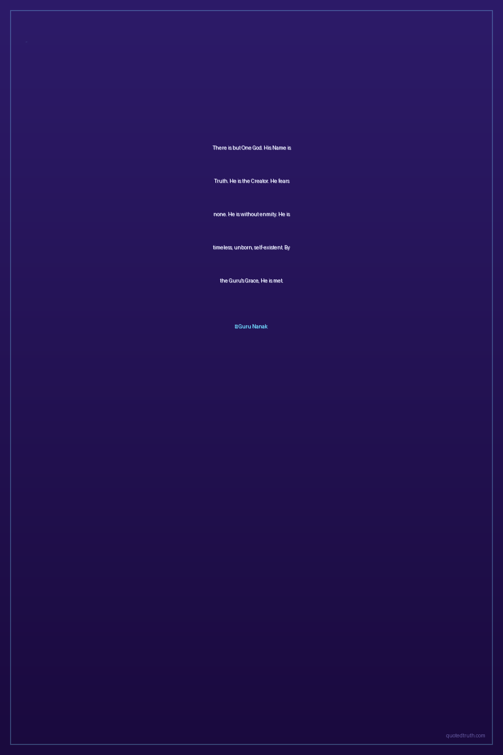 There is but One God. His Name is Truth. He is the Creator. He fears none. He is without enmity. He is timeless, unborn, self-existent. By the Guru's Grace, He is met.
