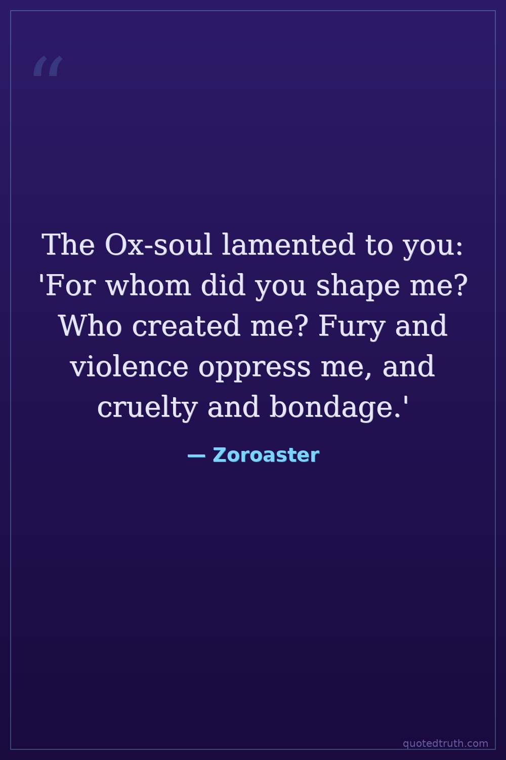 The Ox-soul lamented to you: 'For whom did you shape me? Who created me? Fury and violence oppress me, and cruelty and bondage.'