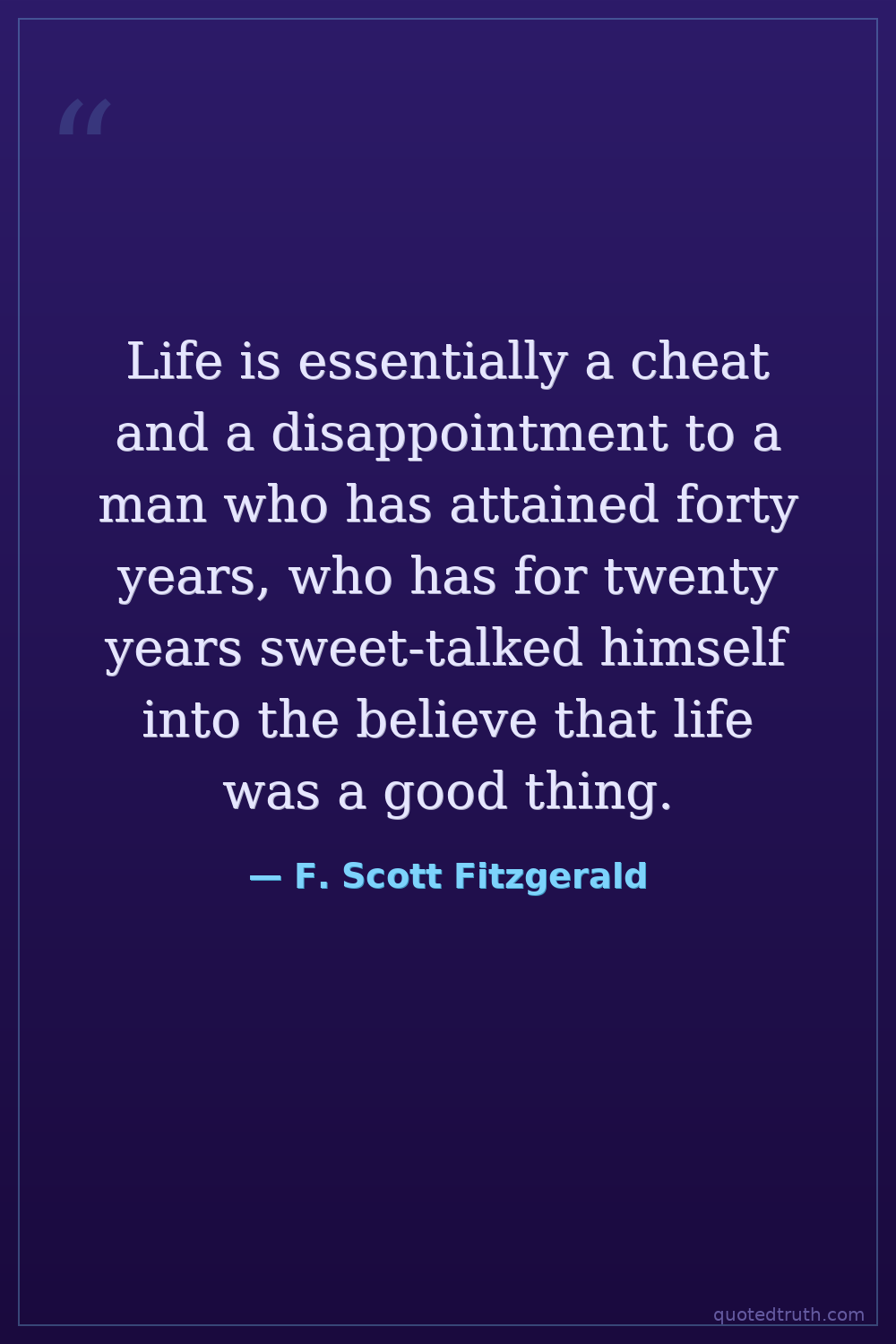 Life is essentially a cheat and a disappointment to a man who has attained forty years, who has for twenty years sweet-talked himself into the believe that life was a good thing.