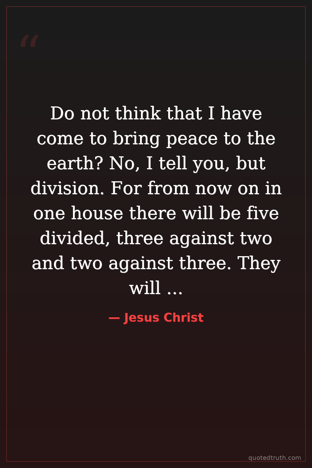 Do not think that I have come to bring peace to the earth? No, I tell you, but division. For from now on in one house there will be five divided, three against two and two against three. They will be divided, father against son and son against father, mother against daughter and daughter against mother, mother-in-law against her daughter-in-law and daughter-in-law against mother-in-law.