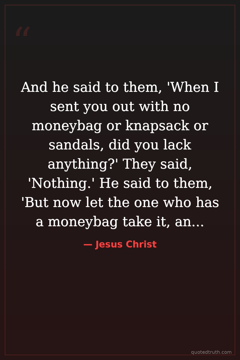 And he said to them, 'When I sent you out with no moneybag or knapsack or sandals, did you lack anything?' They said, 'Nothing.' He said to them, 'But now let the one who has a moneybag take it, and likewise a knapsack. And let the one who has no sword sell his cloak and buy one.'