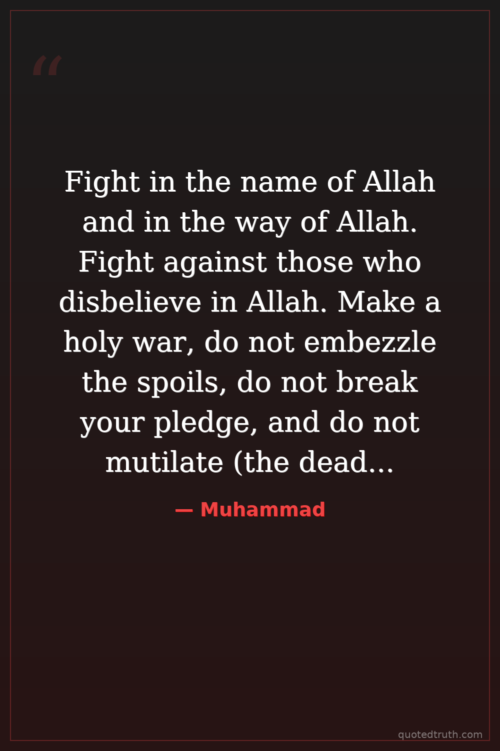 Fight in the name of Allah and in the way of Allah. Fight against those who disbelieve in Allah. Make a holy war, do not embezzle the spoils, do not break your pledge, and do not mutilate (the dead) bodies; do not kill the children.