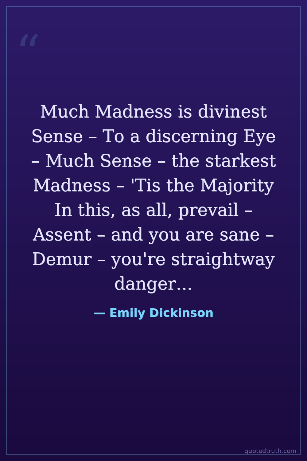 Much Madness is divinest Sense – To a discerning Eye – Much Sense – the starkest Madness – 'Tis the Majority In this, as all, prevail – Assent – and you are sane – Demur – you're straightway dangerous – And handled with a Chain –