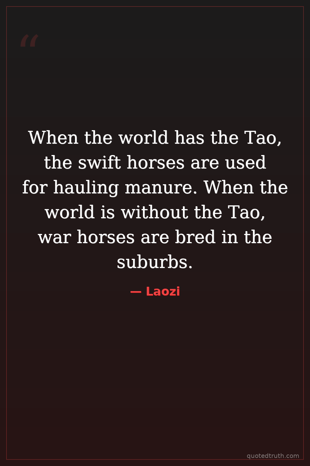 When the world has the Tao, the swift horses are used for hauling manure. When the world is without the Tao, war horses are bred in the suburbs.