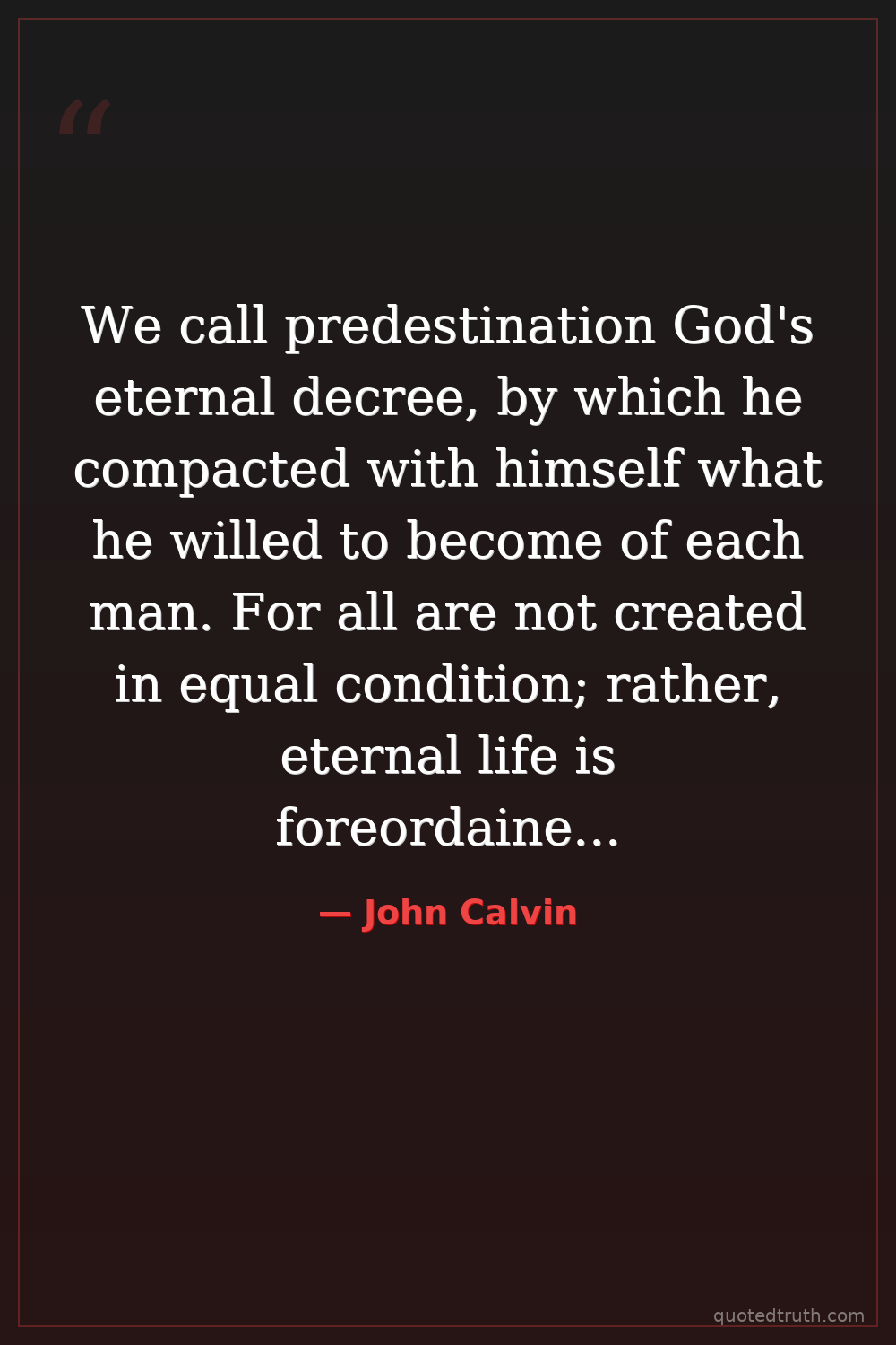 We call predestination God's eternal decree, by which he compacted with himself what he willed to become of each man. For all are not created in equal condition; rather, eternal life is foreordained for some, eternal damnation for others.