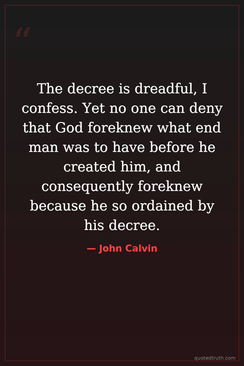 The decree is dreadful, I confess. Yet no one can deny that God foreknew what end man was to have before he created him, and consequently foreknew because he so ordained by his decree.