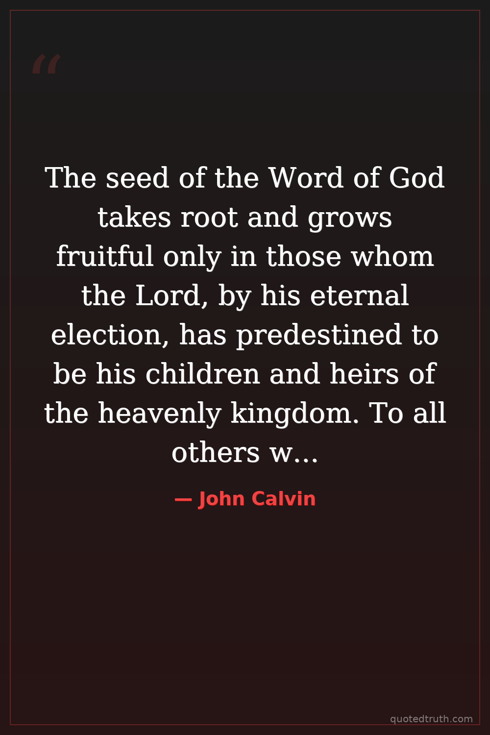 The seed of the Word of God takes root and grows fruitful only in those whom the Lord, by his eternal election, has predestined to be his children and heirs of the heavenly kingdom. To all others who, by the same counsel of God before the constitution of the world, are reprobate, the clear and evident preaching of the truth can be nothing else but an odour of death in death.