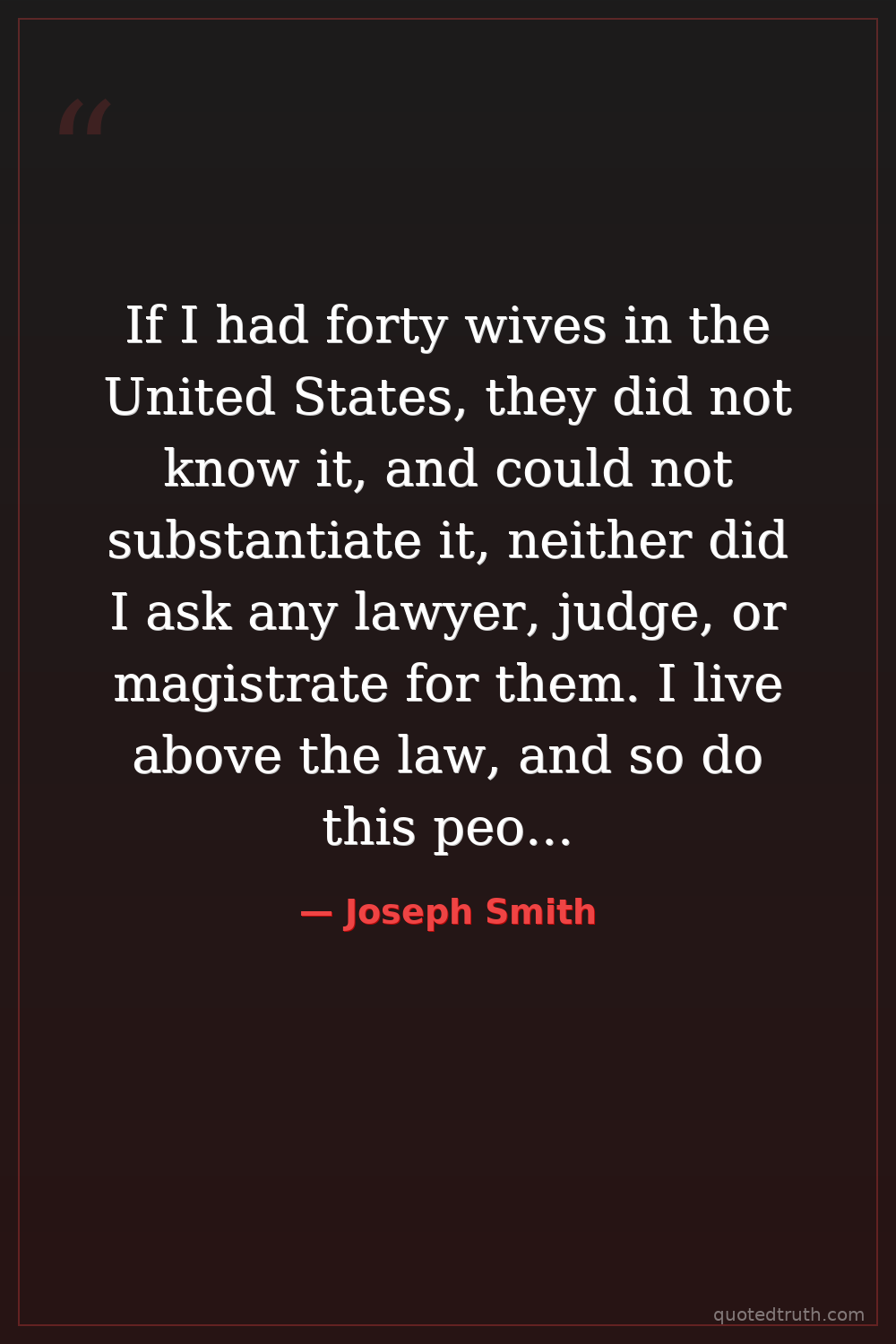 If I had forty wives in the United States, they did not know it, and could not substantiate it, neither did I ask any lawyer, judge, or magistrate for them. I live above the law, and so do this people.