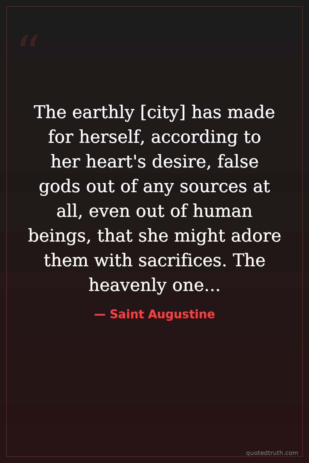 The earthly [city] has made for herself, according to her heart's desire, false gods out of any sources at all, even out of human beings, that she might adore them with sacrifices. The heavenly one, on the other hand, living like a wayfarer in this world, makes no false gods for herself. On the contrary, she herself is made by the true God that she may be herself a true sacrifice to Him.