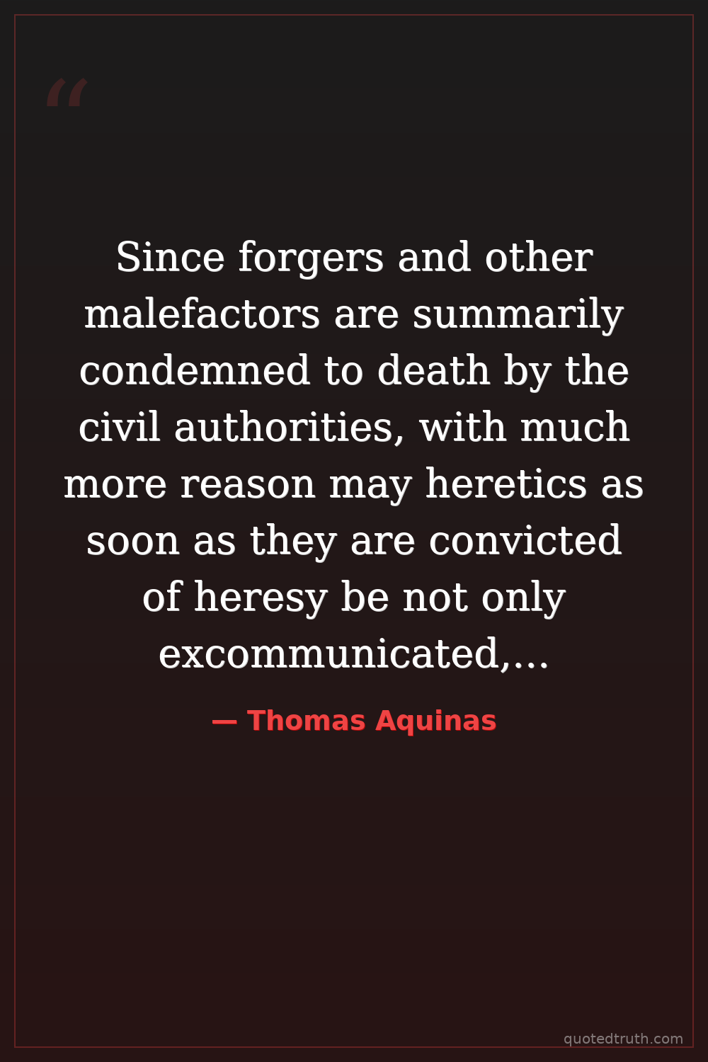 Since forgers and other malefactors are summarily condemned to death by the civil authorities, with much more reason may heretics as soon as they are convicted of heresy be not only excommunicated, but also justly be put to death.