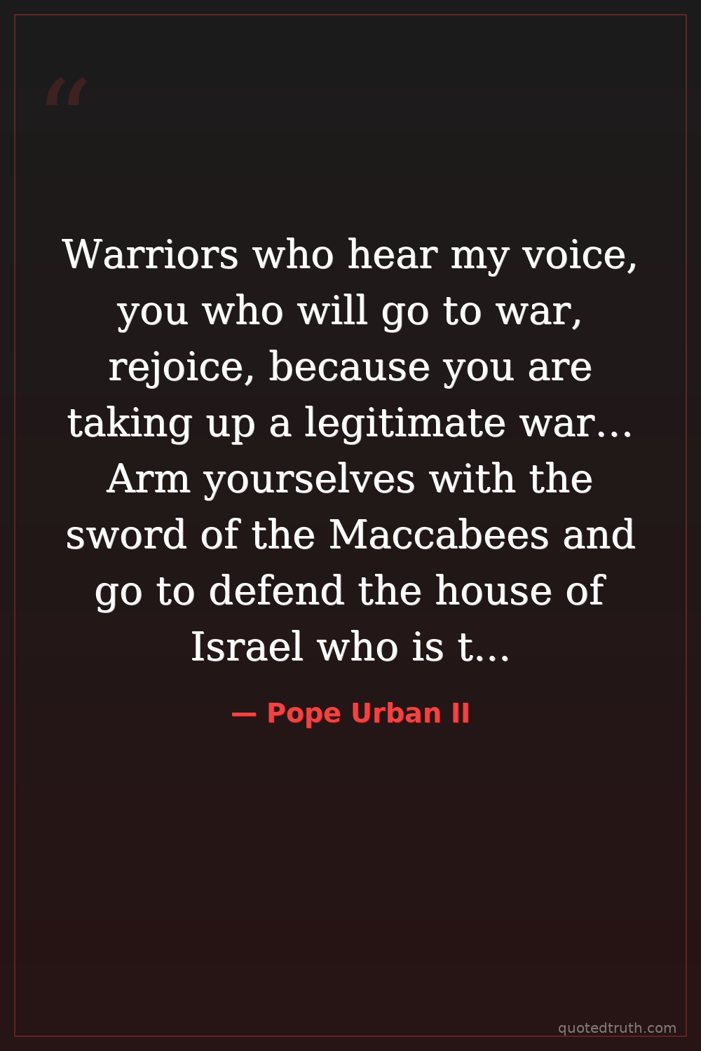 Warriors who hear my voice, you who will go to war, rejoice, because you are taking up a legitimate war… Arm yourselves with the sword of the Maccabees and go to defend the house of Israel who is the daughter of the Lord of Armies.