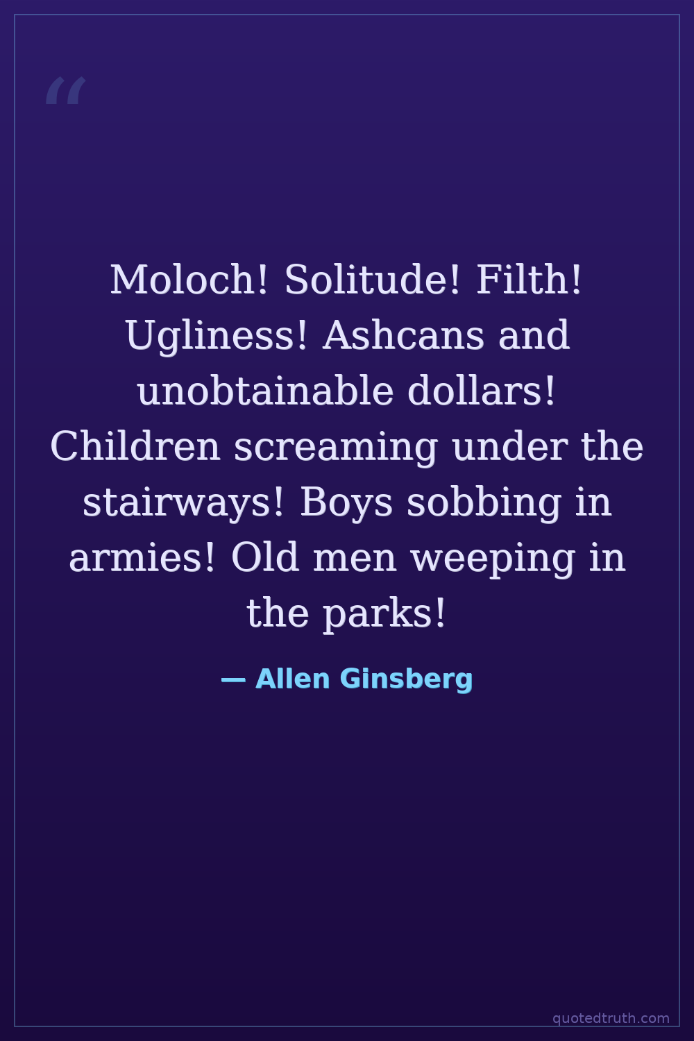 Moloch! Solitude! Filth! Ugliness! Ashcans and unobtainable dollars! Children screaming under the stairways! Boys sobbing in armies! Old men weeping in the parks!