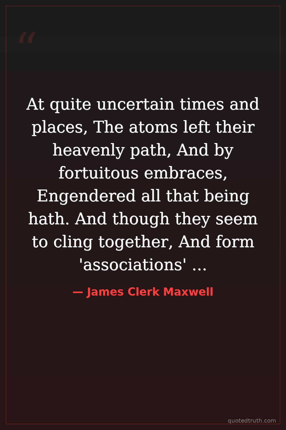 At quite uncertain times and places, The atoms left their heavenly path, And by fortuitous embraces, Engendered all that being hath. And though they seem to cling together, And form 'associations' here, Yet, soon or late, they burst their tether, And through the depths of space career.