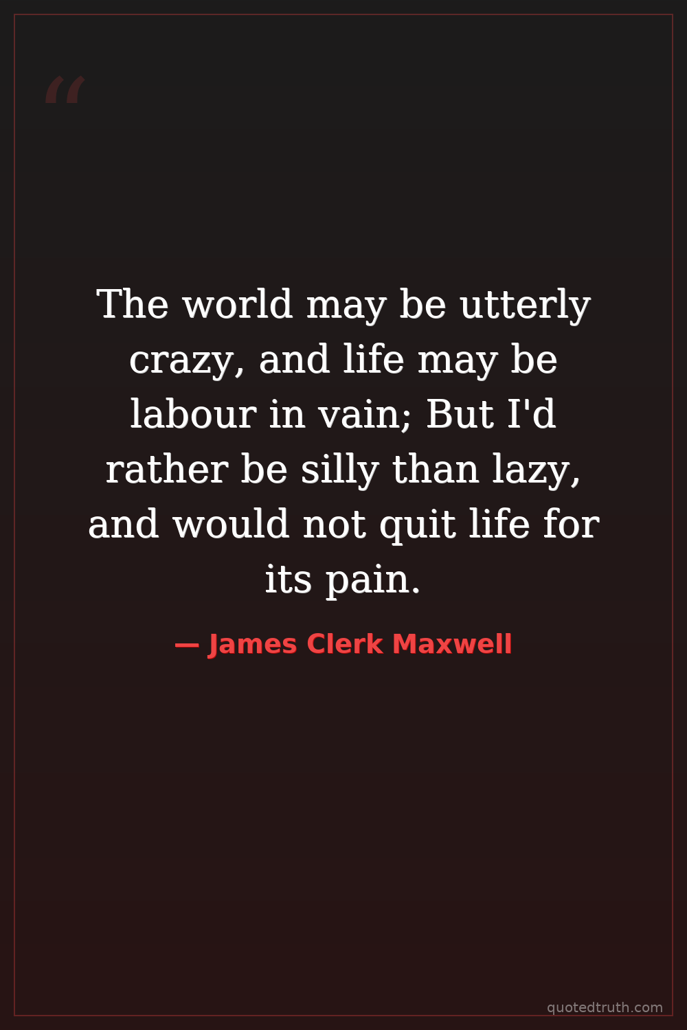 The world may be utterly crazy, and life may be labour in vain; But I'd rather be silly than lazy, and would not quit life for its pain.