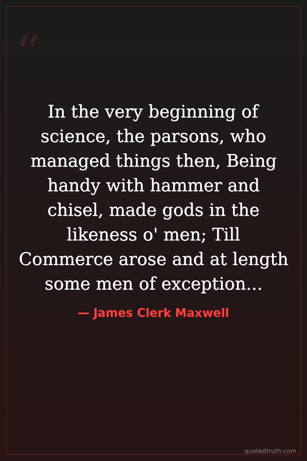 In the very beginning of science, the parsons, who managed things then, Being handy with hammer and chisel, made gods in the likeness o' men; Till Commerce arose and at length some men of exceptional power Supplanted both demons and gods by the atoms, which last to this hour.