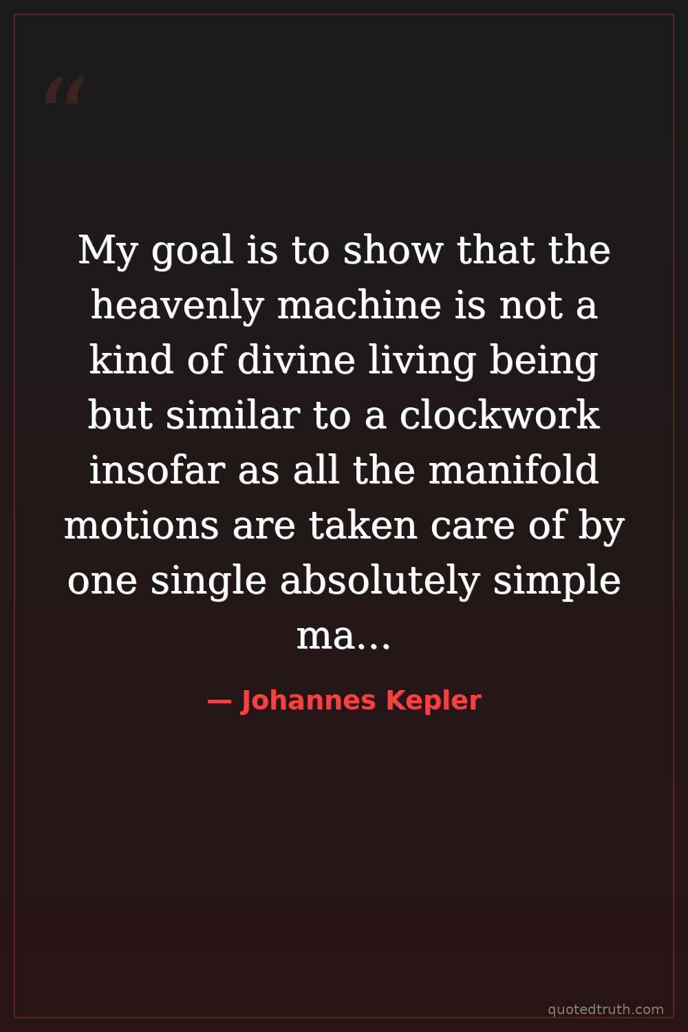 My goal is to show that the heavenly machine is not a kind of divine living being but similar to a clockwork insofar as all the manifold motions are taken care of by one single absolutely simple magnetic bodily force, as in a clockwork all motion is taken care of by a simple weight.